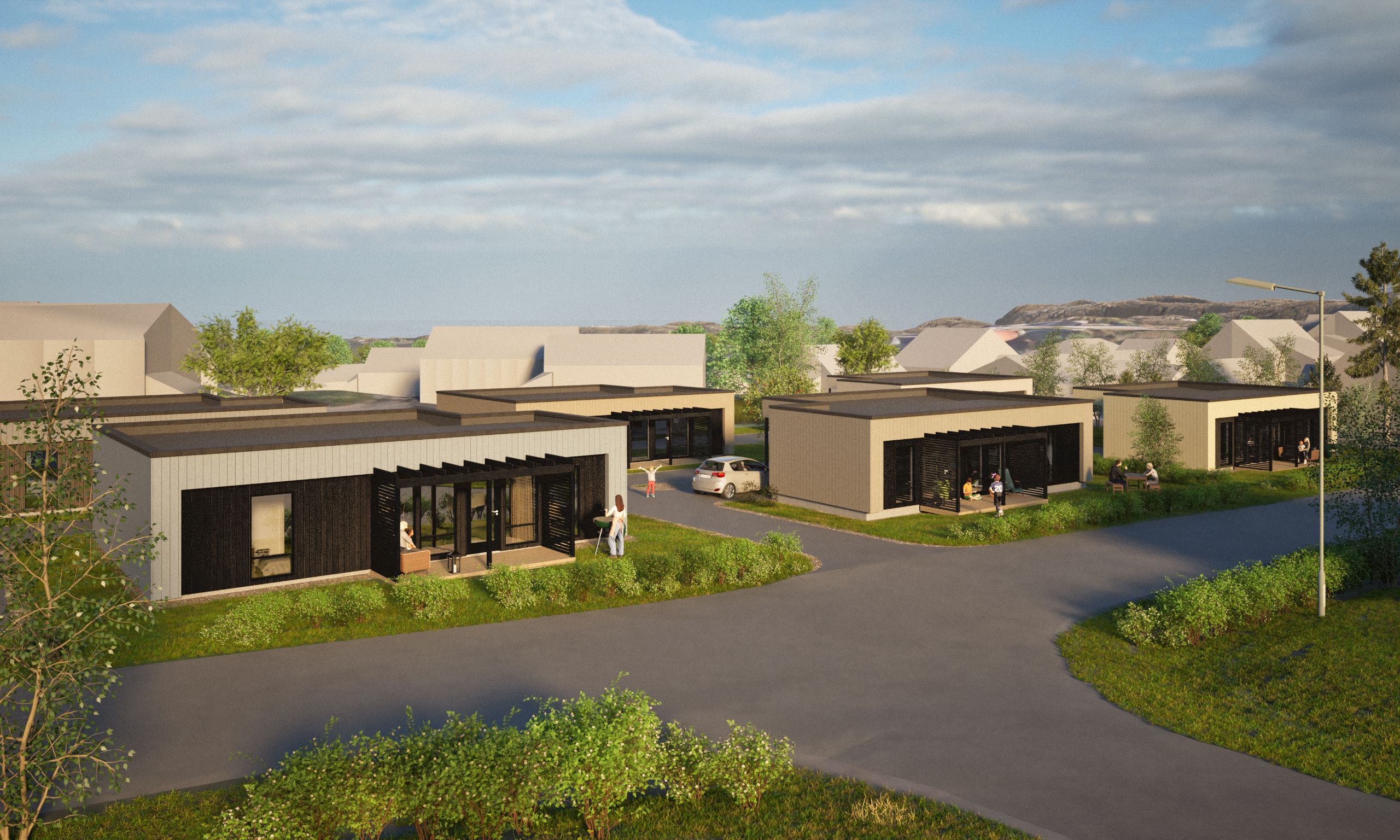 Vedlagte illustrasjoner viser små eneboliger på 60 kvm med carport og pergola.